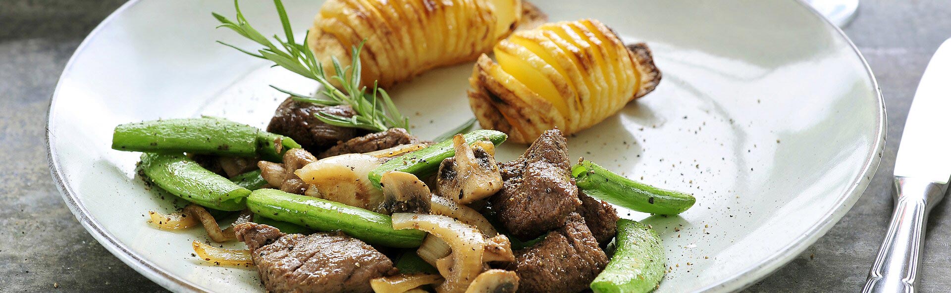 You can cook an excellent steak in the Airfryer. Hasselback potatoes give the dish a playful touch, fun for kids to eat and make after their school-day.