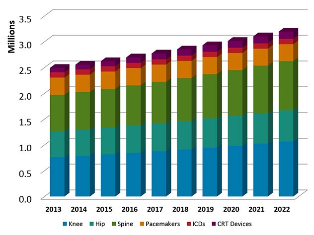 In five major European countries (France, Germany, Italy, Spain, and the UK) more than 2.5 million large joint reconstructions and spinal implant procedures were performed in 2015, a figure expected to rise to more than 3 million in 2020 [1].