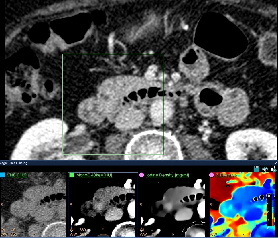 Upon reviewing the conventional CT, the clinician noted that the pancreatic duct appeared to be dilated, but they could not identify the cause from the conventional images. The scan was immediately reviewed using Spectral Magic Glass, which allowed the radiologist to view five different spectral results without changing his workflow. Upon review of the various results, the clinician identified a lesion in the head of the pancreas and the patient was referred for an endoscopic ultrasound biopsy. That pathology report identified a tubular adenoma of the Ampulla of Vater.